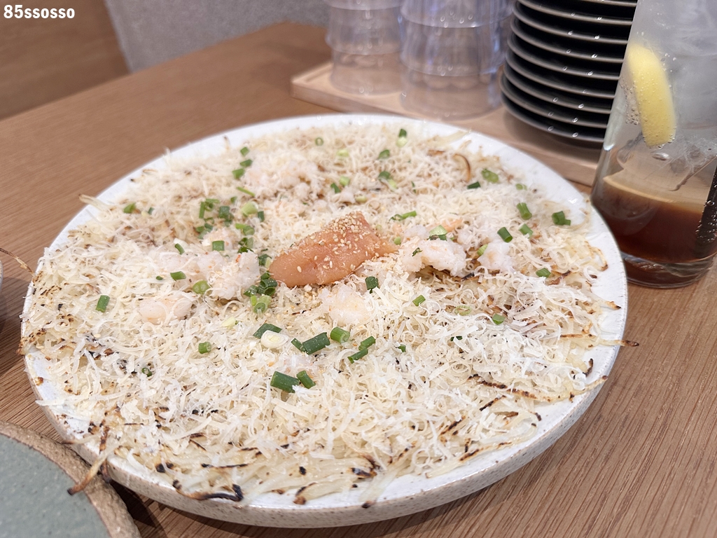 감자채 전에 치즈, 새우, 명란이 올라가서 짭조름하고 맛있었어요 아이들이랑 가면 이 메뉴 추천해요 전 사실 막걸리랑 먹을 일반 감자전 생각하면 주문한 건데 치즈가 듬뿍 올라간 금금 감자전도 색다롭고 너무 맛있었어요