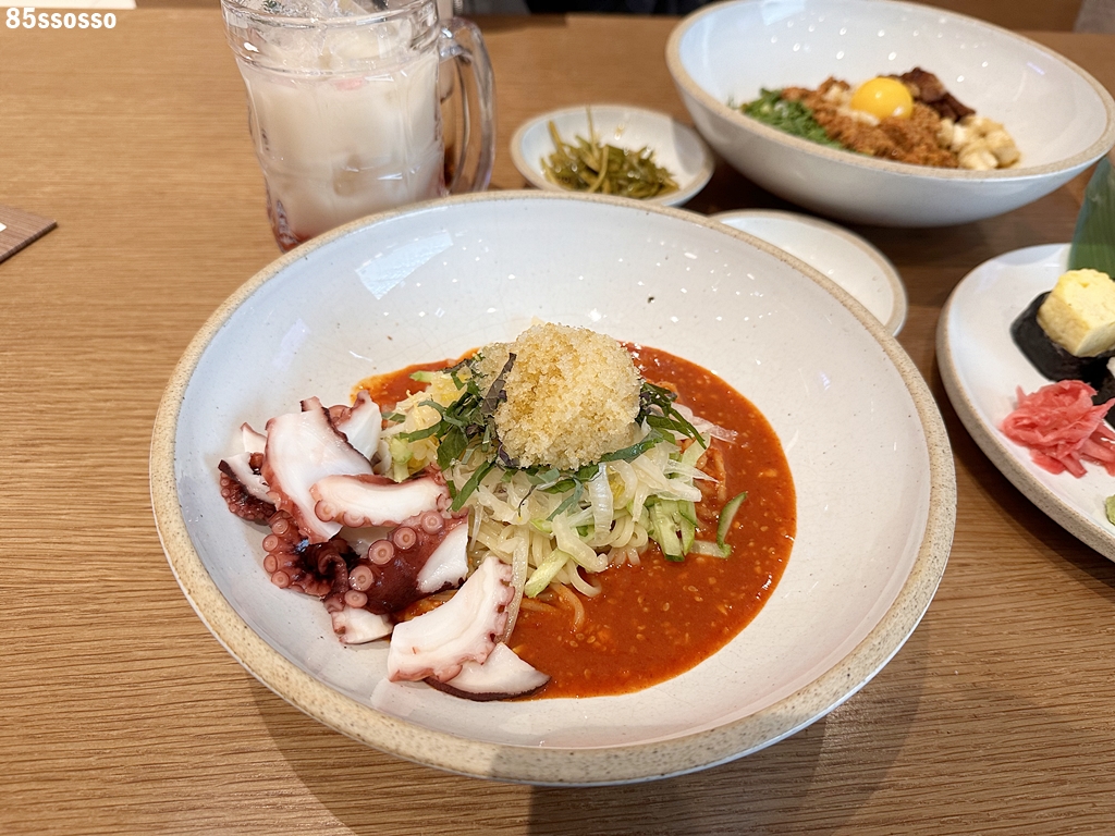 아주 고급진 쫄면 느낌인데 새콤 달콤한 양념장이랑 탱글탱글한 문어와 면발이 잘 어우러져서 한입 먹으면 침이 싹 고여요 고기국수 한번 먹고 문어국수 번갈아 먹어주면 두 그릇도 먹을 거 같아요 뭐가 입 안을 싹 개운하게 해 줘요